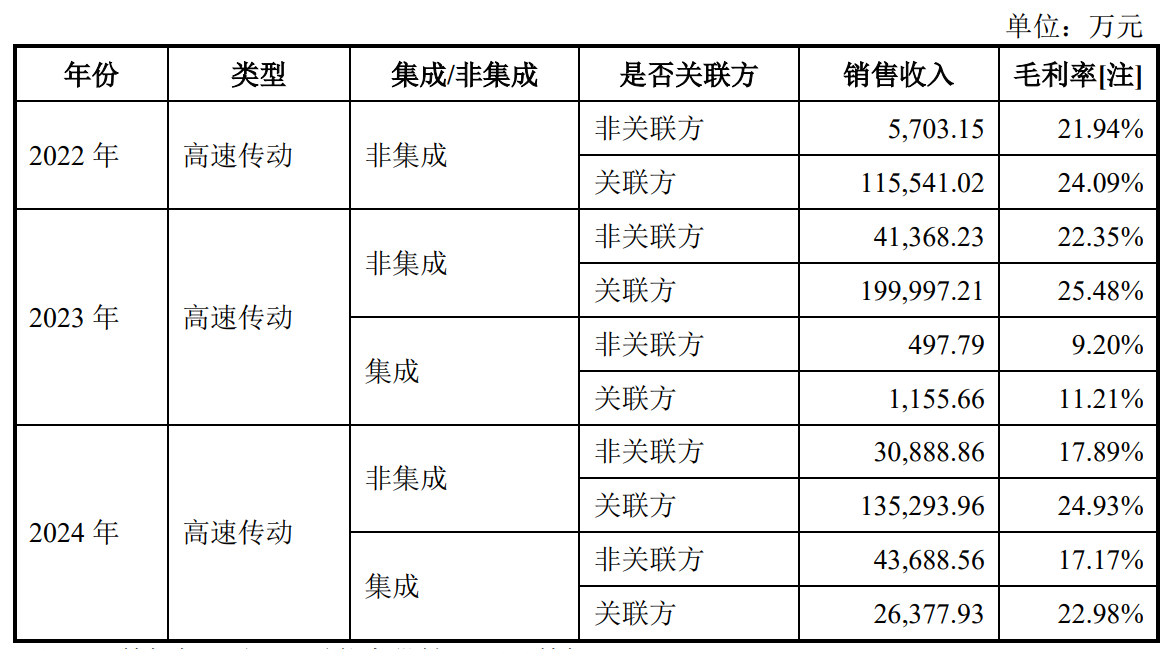 2022年和2023年,德力佳高速传动的集成产品对关联方的销售毛利率分别为22.98%和11.21%,对第三方销售毛利率分别为17.17%和9.20%,公司高速传动的集成产品对关联方的销售毛利率比第三大销售毛利率高了5.81%和2.01%。