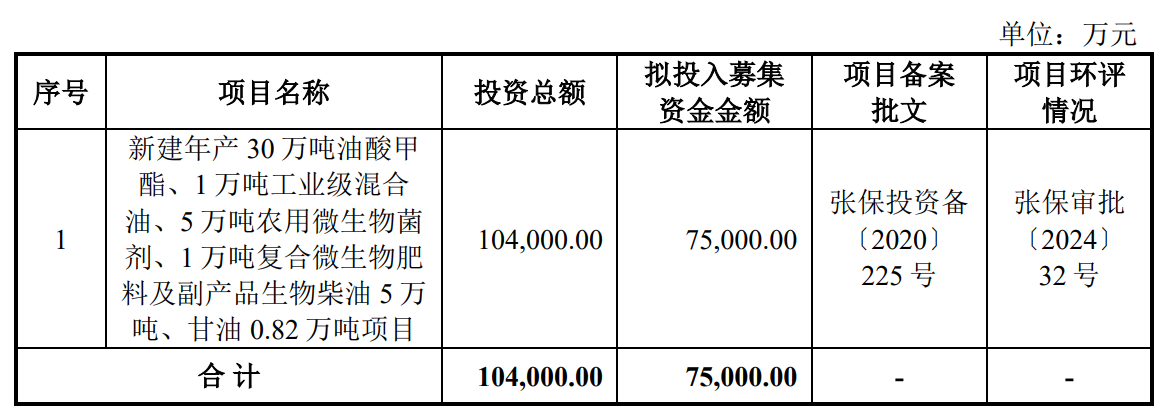 据招股书显示,丰倍生物本次发行拟募集资金75,000.00万元,募集资金扣除本次发行费用后将全部用于公司新建年产30万吨油酸甲酯、1万吨工业级混合油、5万吨农用微生物菌剂、1万吨复合微生物肥料及副产品生物柴油5万吨、甘油0.82万吨项目,具体如下: