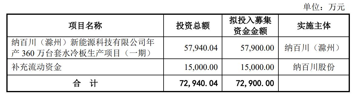 据招股书显示,纳百川本次拟在深交所创业板上市,拟募集资金72,900.00万元,募集资金扣除本次发行费用后将分别用于纳百川(滁州)新能源科技有限公司年产360万台套水冷板生产项目(一期)、补充流动资金,具体如下: