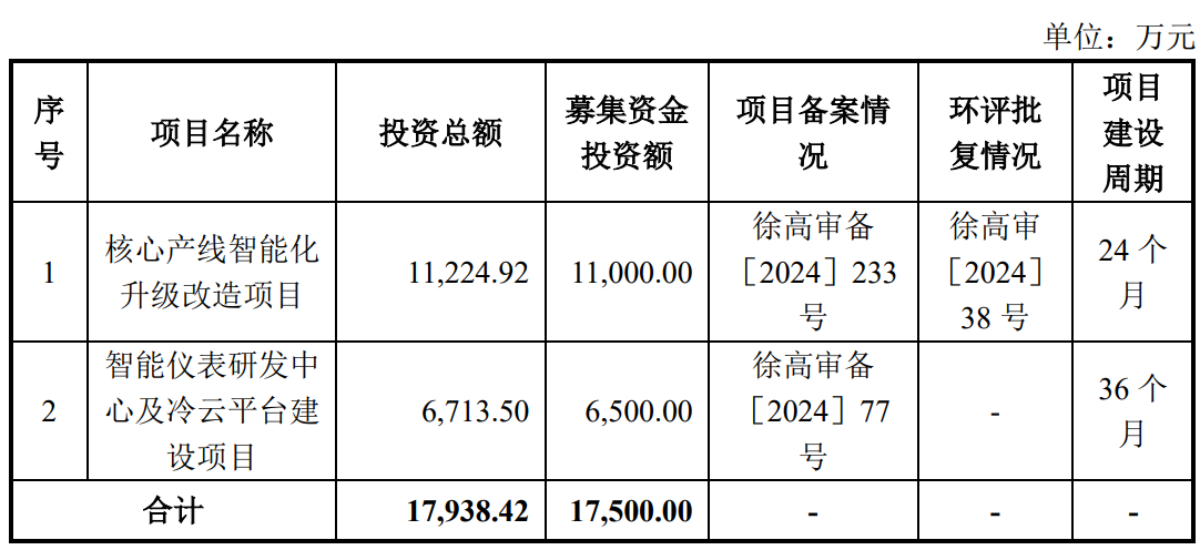 据招股书显示,精创电气本次拟募集资金17,500.00万元,募集资金扣除本次发行费用后将分别用于核心产线智能化升级改造项目、智能仪表研发中心及冷云平台建设项目、营销网络建设项目,具体如下:
