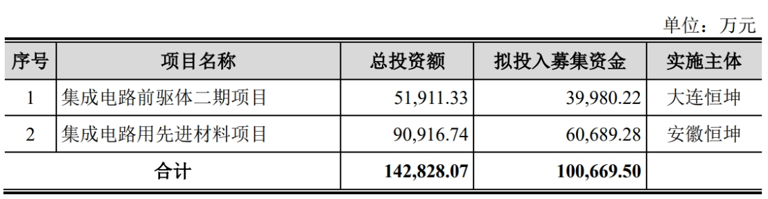 据招股书显示,恒坤新材本次在上交所科创板拟募集资金100,669.50万元,募集资金扣除本次发行费用后将用于公司集成电路前驱体二期项目、集成电路用先进材料项目,具体如下: