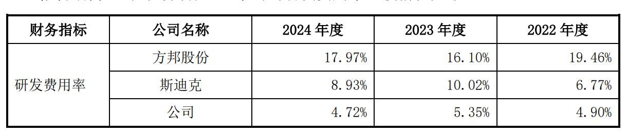 据招股书显示,报告期各期,新广益研发费用分别为2,232.85万元、2,762.37万元和3,104.30万元,分别占当期营业收入比例为4.90%、5.35%和4.72%。值得注意的是,报告期内,新广益同行业可比公司方邦股份的研发费用率分别为19.46%、16.10%和17.97%,斯迪克的研发费用率分别为6.77%、10.02%和8.93%。不难看出,报告期内,新广益研发费用率远低于同行业可比公司。