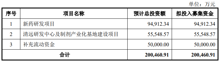 据招股书显示,必贝特本次拟募集资金200,460.91万元,募集资金扣除本次发行费用后将用于公司新药研发项目、清远研发中心及制剂产业化基地建设项目以及补充流动资金,具体如下: