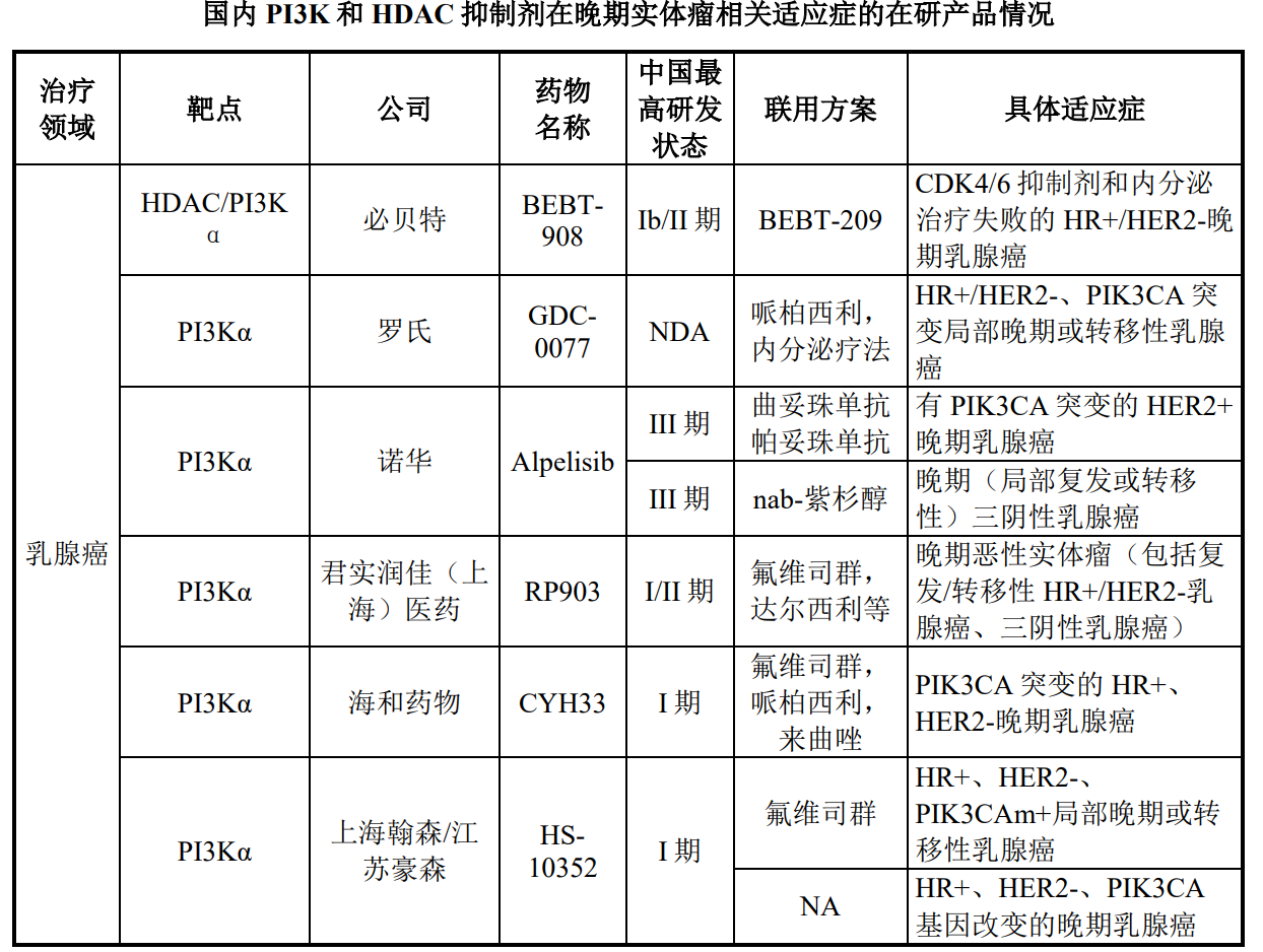 截至2025年6月30日,除BEBT-908外,国内外尚未有其他HDAC/PI3Kα抑制剂获批准上市,国内也没有其它同类双靶点抑制剂在研。通过单靶点市场分析,中国已批准上市的PI3K抑制剂有石药集团引进的度维利塞胶囊(Duvelisib)、璎黎药业的林普利塞片、拜耳医药的盐酸可泮利塞和罗氏的伊那利塞,适应症方面仅伊那利塞获批用于治疗实体瘤,用于内分泌治疗耐药(包括在辅助内分泌治疗期间或之后出现复发)、PIK3CA突变、HR+/HER2-的局部晚期或转移性乳腺癌。PI3Kα是目前经治疗实体瘤临床验证的唯一PI3K亚型酶。目前中国已批准上市的HDAC抑制剂有西达本胺和恩替司他片,实体瘤适应症方面西达本胺被批准联合芳香酶抑制剂用于治疗HR+/HER2-、绝经后、经内分泌治疗复发或进展的局部晚期或转移性乳腺癌,恩替司他片被批准联合芳香化酶抑制剂用于治疗HR+/HER2-、经内分泌治疗复发或进展的局部晚期或转移性乳腺癌。