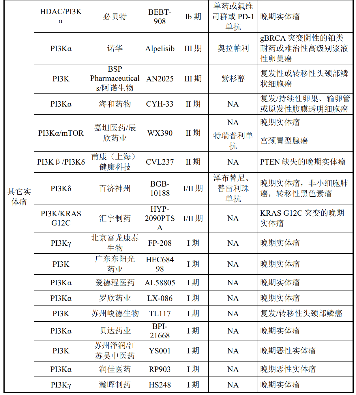 事实上,针对晚期实体瘤适应症正在研发的PI3K抑制剂或HDAC抑制剂国内已已有多家公司的在研产品处于临床研究阶段,甚至一大部分的产品的研发进度已经超过了必贝特,具体如下: