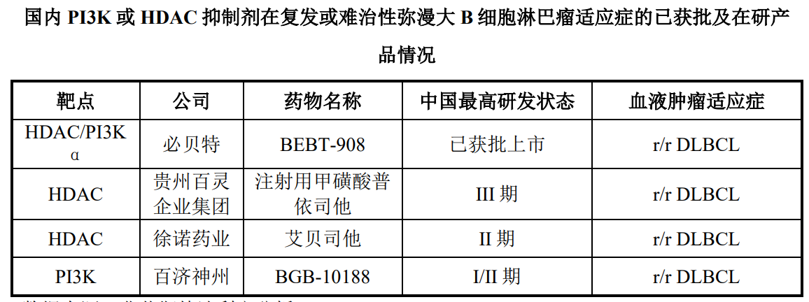 此外,截至2025年6月30日,针对复发或难治性弥漫大B细胞淋巴瘤适应症,除必贝特已获批的BEBT-908以外,国内在研的处于临床研究阶段的PI3K抑制剂或HDAC抑制剂有徐诺药业的艾贝司他(一种HDAC抑制剂)、贵州百灵企业集团的注射用甲磺酸普依司他(一种HDAC抑制剂)和百济神州的BGB10188(一种PI3K抑制剂)均已进入临床研究阶段。