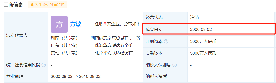 熊燕现担任必贝特副董事长,据招股书熊燕简历显示,在1997年1月至2000年12月期间,熊燕曾担任珠海华嘉联达五金矿产进出口有限公司(以下简称“华嘉联达”)总经理。而据华嘉联达工商信息显示,华嘉联达成立于2000年8月2日,这足足比熊燕开始担任华嘉联达总经理的时间还晚了三年多,这显然是不符合实际的。
