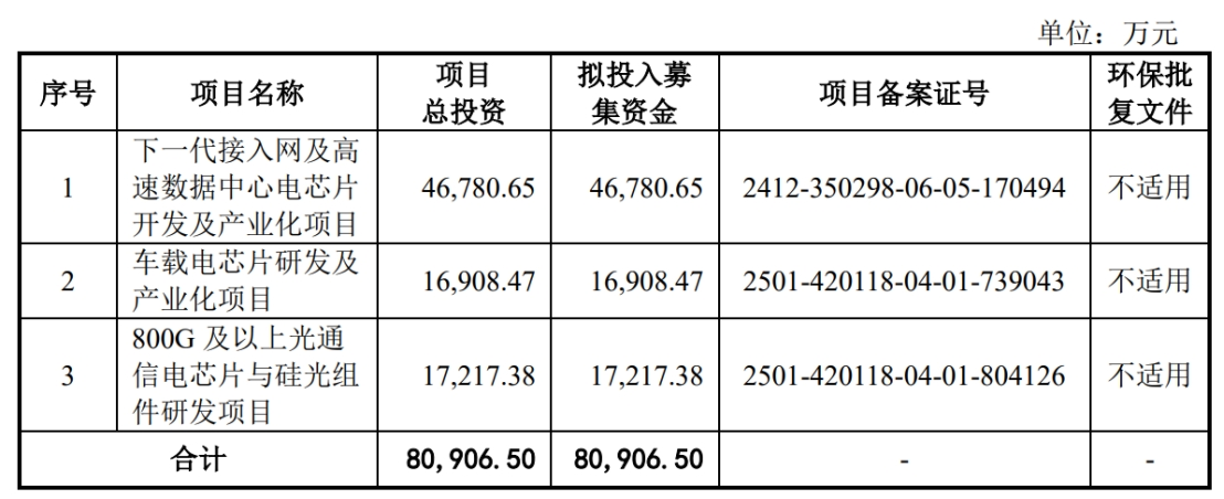 据招股书显示,优迅股份本次拟募集资金80,906.50万元,募集资金扣除本次发行费用后将用于公司下一代接入网及高速数据中心电芯片开发及产业化项目、车载电芯片研发及产业化项目、800G及以上光通信电芯片与硅光组件研发项目,具体如下: