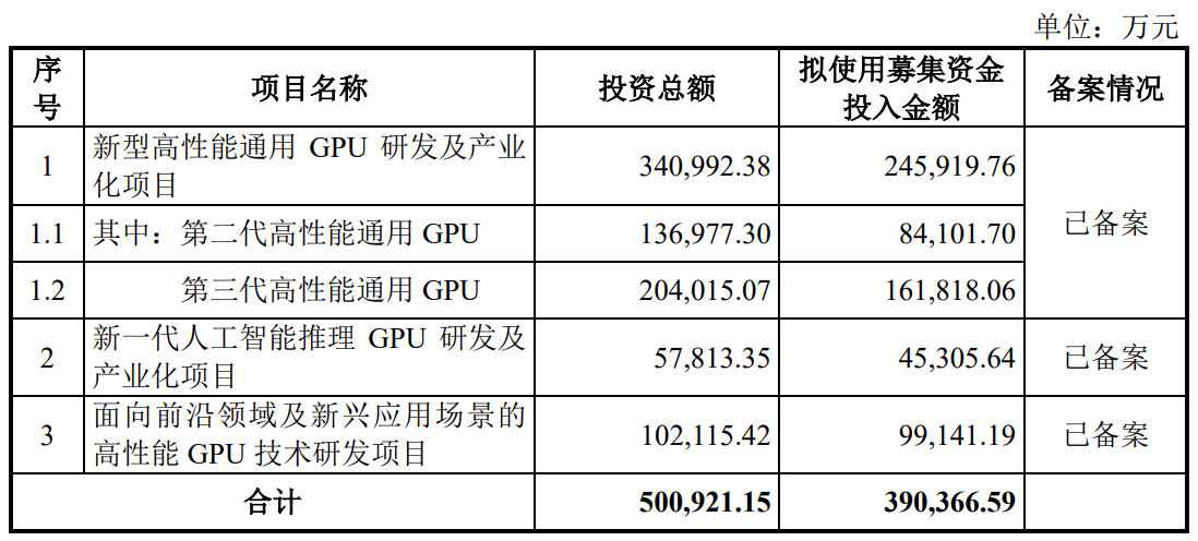 招股书显示,沐曦股份拟在上交所科创板上市,募集资金390,366.59万元,募集资金扣除本次发行费用后将用于新型高性能通用GPU研发及产业化项目、新一代人工智能推理GPU研发及产业化项目、面向前沿领域及新兴应用场景的高性能GPU技术研发项目,具体如下: