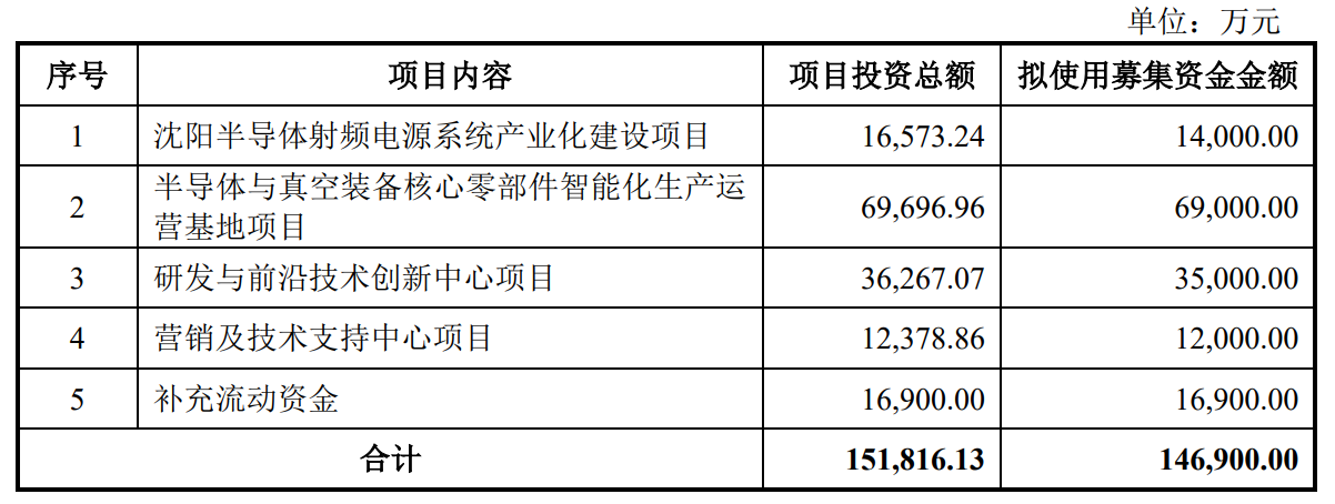 据招股书显示,恒运昌拟在上交所科创板上市,募集资金146,900.00万元,募集资金扣除本次发行费用后将用于沈阳半导体射频电源系统产业化建设项目、半导体与真空装备核心零部件智能化生产运营基地项目、研发与前沿技术创新中心项目、营销及技术支持中心项目、补充流动资金,具体如下: