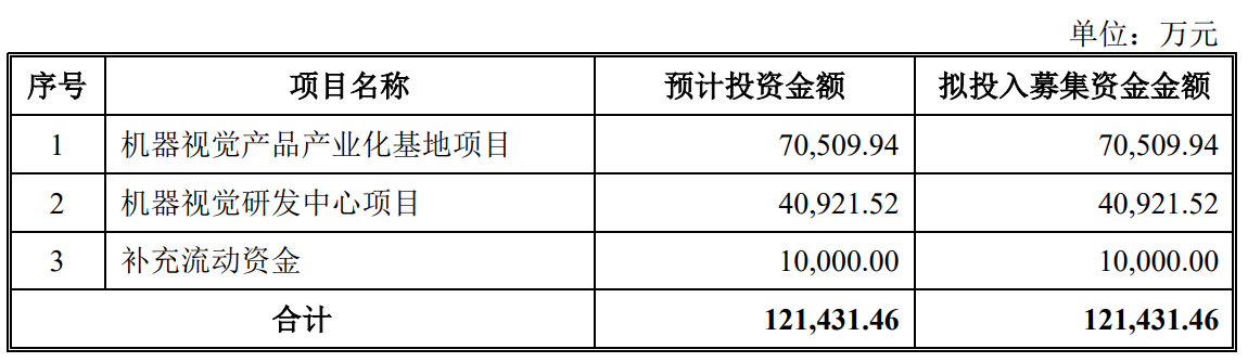 据招股书显示,易思维本次拟募集资金121,431.46万元,募集资金扣除本次发行费用后将分别用于公司机器视觉产品产业化基地项目、机器视觉研发中心项目、补充流动资金,具体如下:
