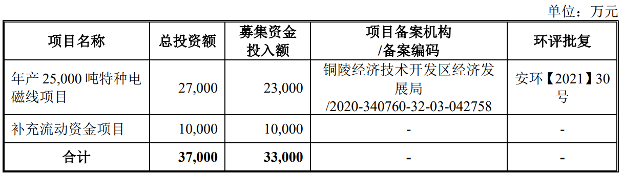 据招股书显示,兢强科技拟在北交所募集资金33,000万元,募集资金扣除本次发行费用后将用于公司年产25,000吨特种电磁线项目、补充流动资金项目。