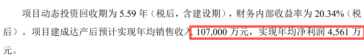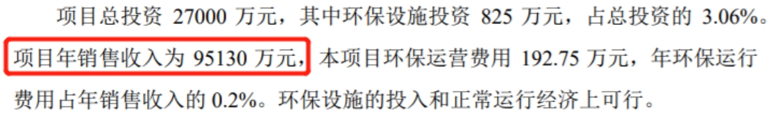 据招股书显示,年产25,000吨特种电磁线项目作为兢强科技另一募投项目,也为兢强科技本次IPO的主要募投项目,该项目建成投产后预计三年实现达产,达产后预计实现年均销售收入107,000万元,实现年均净利润4,561万元。而据兢强科技该项目的环评文件显示,该项目年销售收入将达到95,130万元,比招股书披露的金额高出8,130万元。