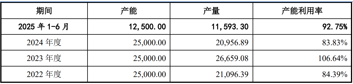 报告期各期,永大股份产能分别为25,000吨、25,000吨、25,000吨、12,500.00吨,产量分别为21,096.39吨、26,659.08吨、20,956.89吨、11,593.30吨,对应产能利用率分别为84.39%、106.64%吨、83.83%、92.75%。可以看出,报告期内仅仅只有在2023年的产能利用率实现了饱和,之后便呈现下降的趋势。