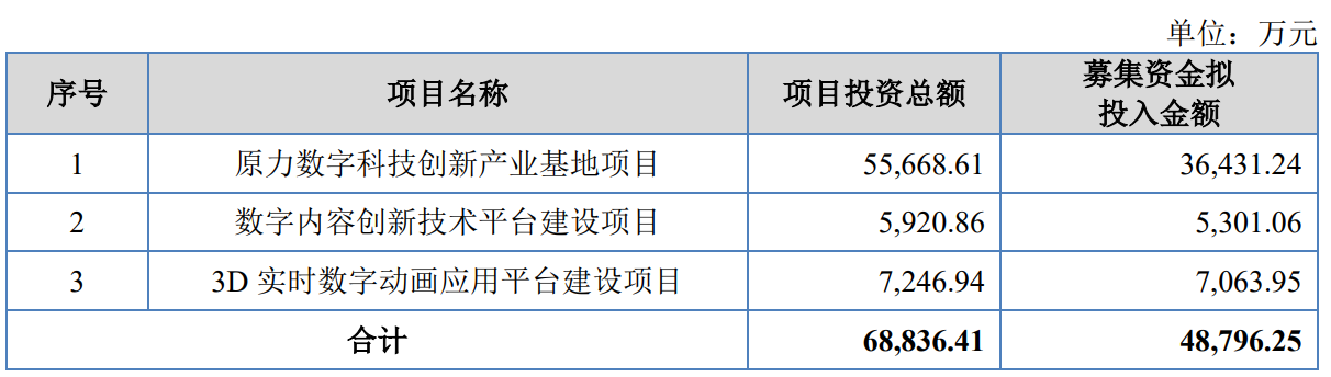 据招股书显示,原力数字拟募集资金48,796.25万元,募集资金扣除本次发行费用后将分别用于原力数字科技创新产业基地项目、数字内容创新技术平台建设项目、3D实时数字动画应用平台建设项目,具体如下: