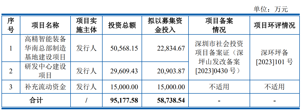 据招股书显示,尚水智能拟在深交所创业板上市,拟募集资金58,738.54万元,募集资金扣除本次发行费用后将分别用于高精智能装备华南总部制造基地建设项目、研发中心建设项目、补充流动资金,具体如下: