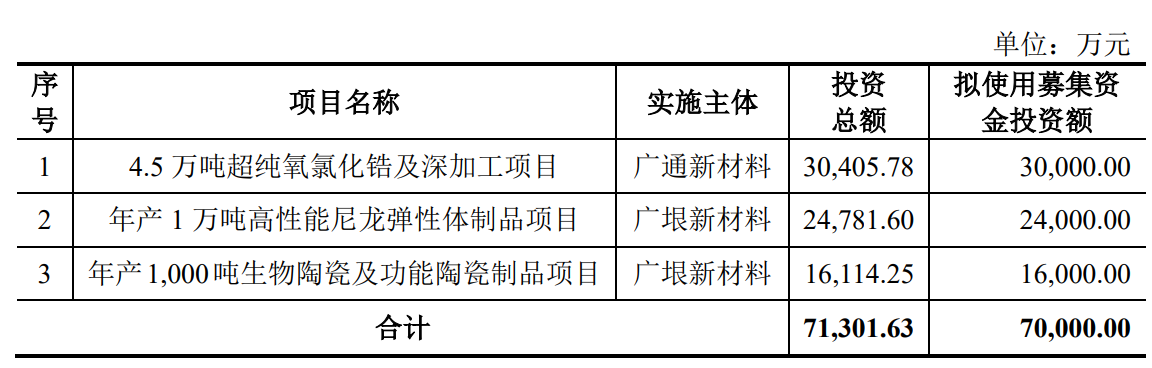 据招股书显示,长裕集团本次拟募集资金为70,000.00万元,募集资金扣除本次发行费用后将分别用于公司4.5万吨超纯氧氯化锆及深加工项目、年产1万吨高性能尼龙弹性体制品项目以及年产1,000吨生物陶瓷及功能陶瓷制品项目,具体如下: