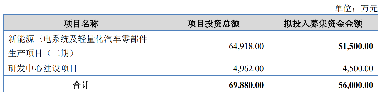 据招股书显示,隆源股份本次拟募集资金56,000.00万元,募集资金扣除本次发行费用后将分别用于公司新能源三电系统及轻量化汽车零部件生产项目(二期)、研发中心建设项目,具体如下:
