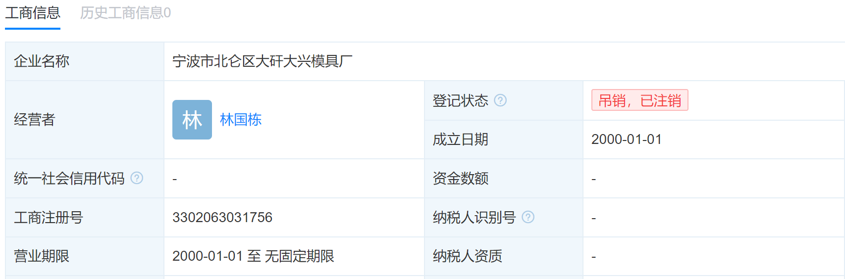 另外,据招股书林国栋简历显示,1993年9月至2001年4月,林国栋曾任宁波市北仑区大矸大兴模具厂(以下简称“大矸大兴”)厂长。值得注意的是,据大矸大兴工商信息显示,大矸大兴成立于2000年1月,目前该公司已经注销。但是从时间上来看,林国栋开始担任大矸大兴厂长的时间比大矸大兴成立的时间早了六年半,这似乎并不符合情理。