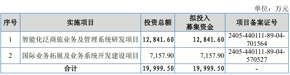 据招股书显示,美亚科技本次拟募集资金35,999.41万元,募集资金扣除本次发行费用后将分别用于公司智能化泛商旅业务及管理系统研发项目、国际业务拓展及业务系统开发建设项目、品牌宣传及营销渠道建设项目、补充流动资金,具体如下: