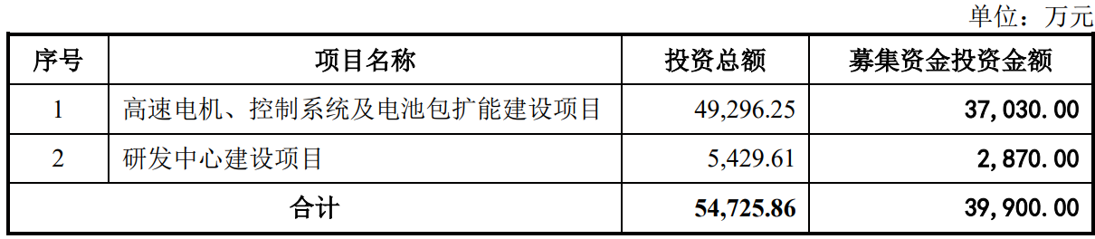 据招股书显示,晨光电机本次拟募集资金39,900.00万元,募集资金扣除本次发行费用后将用于公司“高速电机、控制系统及电池包扩能建设项目”、“研发中心建设项目”,具体如下:
