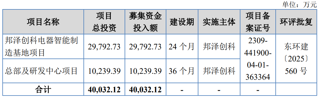 据招股书显示,邦泽创科本次拟募集资金40,032.12万元,募集资金扣除本次发行费用后将用于邦泽创科电器智能制造基地项目、总部及研发中心项目,具体如下: