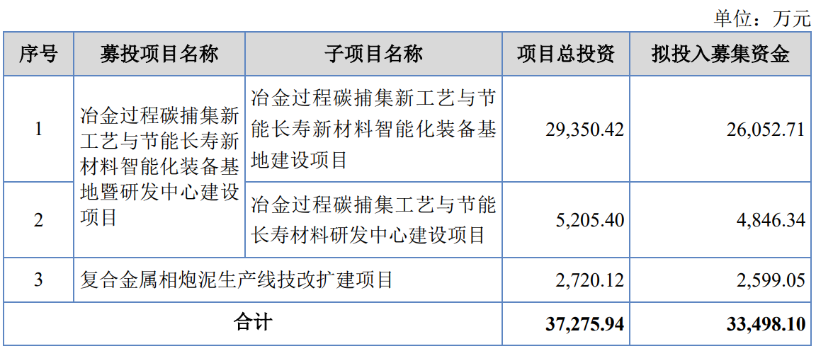 据招股书先生,“冶金过程碳捕集新工艺与节能长寿新材料智能化装备基地暨研发中心建设项目”为瑞尔竞达本次最大募投项目,该项目由“冶金过程碳捕集新工艺与节能长寿新材料智能化装备基地建设项目”和“冶金过程碳捕集工艺与节能长寿材料研发中心建设项目”组成,合计总投资额3.46亿元,拟投入募集资金3.09亿元。