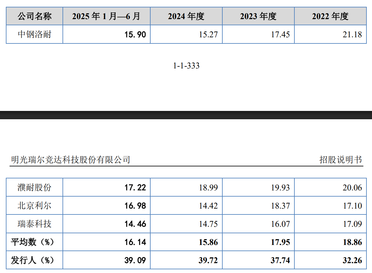据招股书显示,报告期各期,瑞尔竞达研发费用分别为1,506.18万元、1,673.18万元、2,192.25万元、749.23万元,占当期营业收入的比例分别为3.74%、3.58%、4.60%、3.30%。同期同行业可比公司研发费用率均值分别为4.64%、4.13%、4.57%、4.63%。可以看出,报告期内,瑞尔竞达研发费用率仅只有在2024年与同行业可比公司均值接近,其余各年度都明显低于同行业可比公司均值。