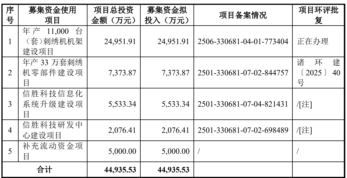据招股书显示,信胜科技本次拟在北交所上市,拟募集资金44,935.53万元,募集资金扣除本次发行费用后将分别用于公司年产11,000台(套)刺绣机机架建设项目、年产33万套刺绣机零部件建设项目、信胜科技信息化系统升级建设项目、信胜科技研发中心建设项目、补充流动资金项目,具体如下: