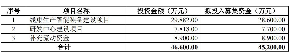 据招股书显示,海昌智能本次拟募集资金45,200.00万元,募集资金扣除本次发行费用后将用于公司线束生产智能装备建设项目、研发中心建设项目、补充流动资金,具体如下: