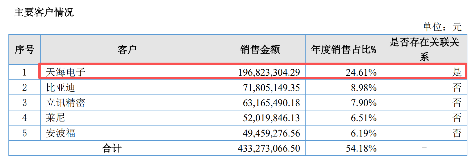据海昌智能2024年年度报告显示,在2024年度中,海昌智能的前五大客户(1-5)分别为天海电子、比亚迪、立讯精密、莱尼、安波福,对应销售金额分别为19,682.33万元、7,180.51万元、6,316.55万元、5,201.98万元、4,945.93万元。