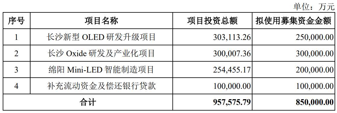 据招股书显示,惠科股份本次拟在深交所主板上市,拟募集资金850,000.00万元,募集资金扣除本次发行费用后将分别用于公司长沙新型OLED研发升级项目、长沙Oxide研发及产业化项目、绵阳Mini-LED智能制造项目、补充流动资金及偿还银行贷款,具体如下:
