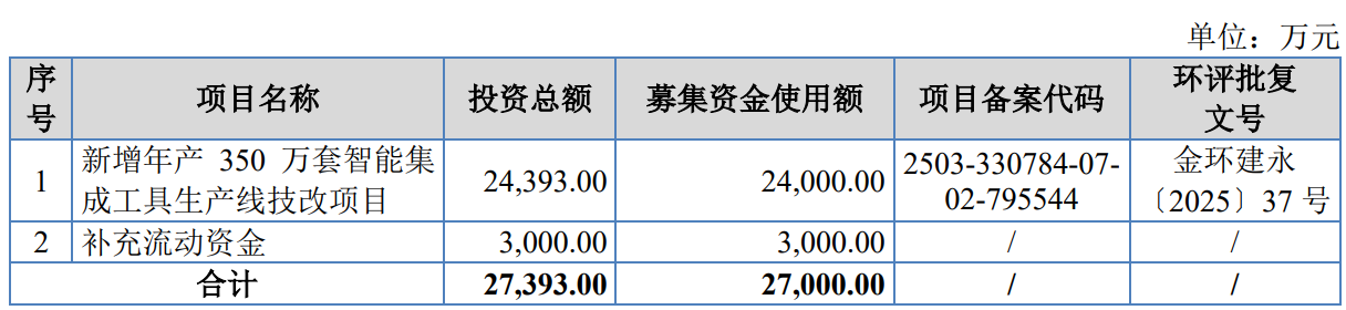 据招股书显示,德硕科技拟募集资金27,000.00万元,募集资金扣除本次发行费用后将用于公司新增年产350万套智能集成工具生产线技改项目、补充流动资金,具体如下: