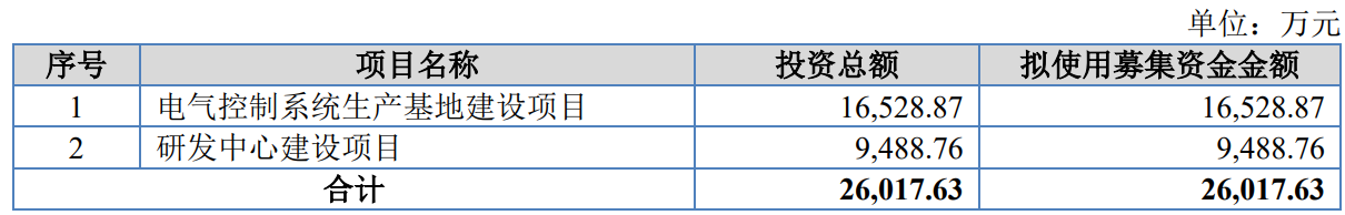 据招股书显示,嘉晨智能本次拟募集资金26,017.63万元,募集资金扣除本次发行费用后将分别用于电气控制系统生产基地建设项目、研发中心建设项目,具体如下: