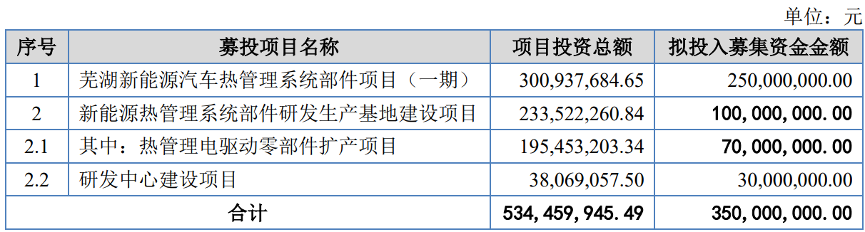 据招股书显示,朗信电气拟在北交所募集资金350,000,000.00元,募集资金扣除本次发行费用后将分别用于公司芜湖新能源汽车热管理系统部件项目(一期)、新能源热管理系统部件研发生产基地建设项目,具体如下: