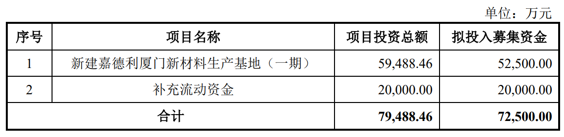据招股书显示,嘉德利本次拟募集资金72,500.00万元,募集资金扣除本次发行费用后将用于新建嘉德利厦门新材料生产基地(一期)、补充流动资金,具体如下: