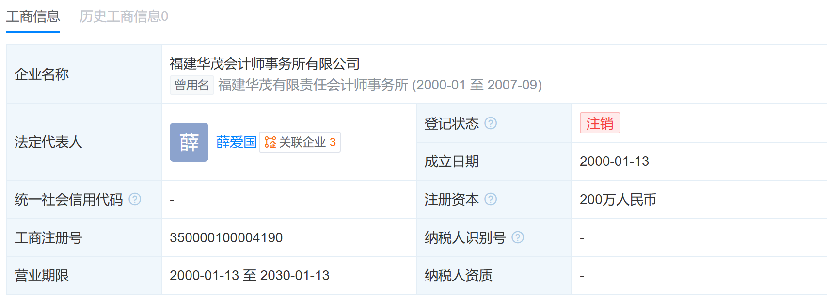 据福建华茂工商信息显示,福建华茂成立于2000年1月,现已注销。而从时间不难看出,福建华茂成立的时间竟然比陈榕女士开始在福建华茂任职的时间还晚了一个季度,这是否合理?