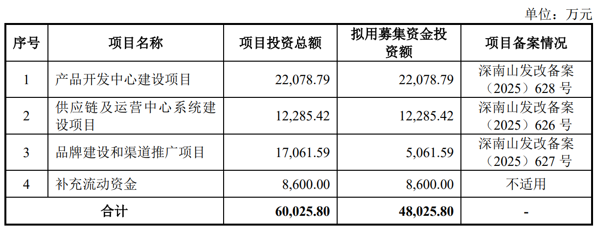 据招股书显示,千岸科技拟募集资金48,025.80万元,募集资金扣除本次发行费用后将用于公司产品开发中心建设项目、供应链及运营中心系统建设项目、品牌建设和渠道推广项目、补充流动资金,具体如下: