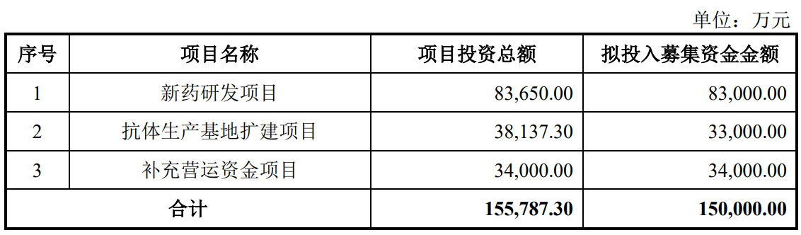 据招股书显示,泰诺麦博本次拟募集资金150,000.00万元,募集资金扣除本次发行费用后将用于公司新药研发项目、抗体生产基地扩建项目、补充营运资金项目,具体如下: