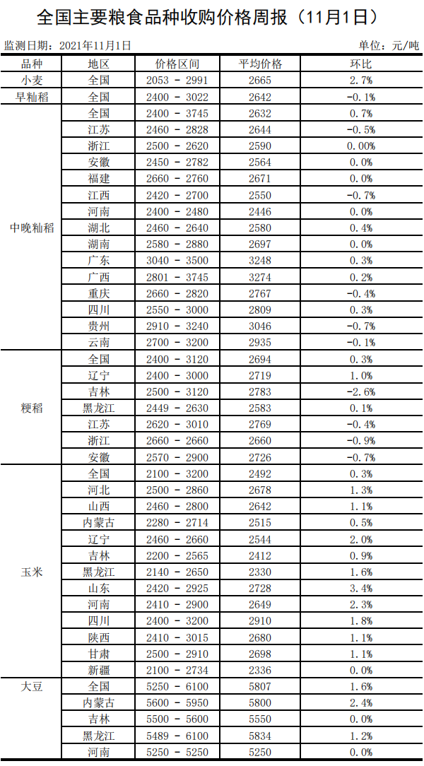 中沪网金融 全国主要粮食品种收购价格周报(11月1日) 中沪网 | 2021-11-12 13:59:21 87119 原标题:全国主要粮食品种收购价格周报(11月1日) 来源:粮食和储备局网站 免责声明: 如有关于作品内容、版权或其它问题请于作品发布后的30日内与我们联系。 中沪网 zhonghucaijing.com
